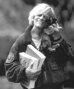 ![]() 1990 auf seinem Anwesen in Lagunitas, Californien: Kinski hält das getippte Manuskript seiner Biographie in Händen. |
